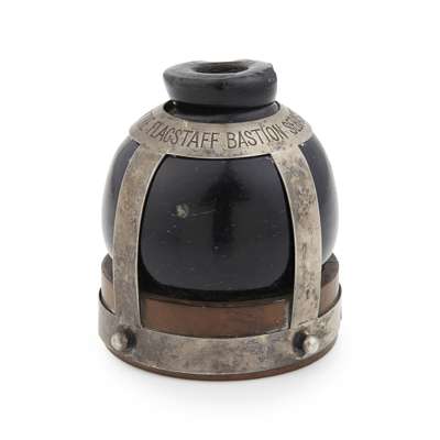 the wood disc of pole with an arched silver framework holding a glass grenade, the silver engraved 'From the Flagstaff Bastion Sebastopol, 10th Sept 1855'