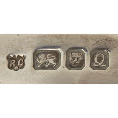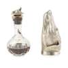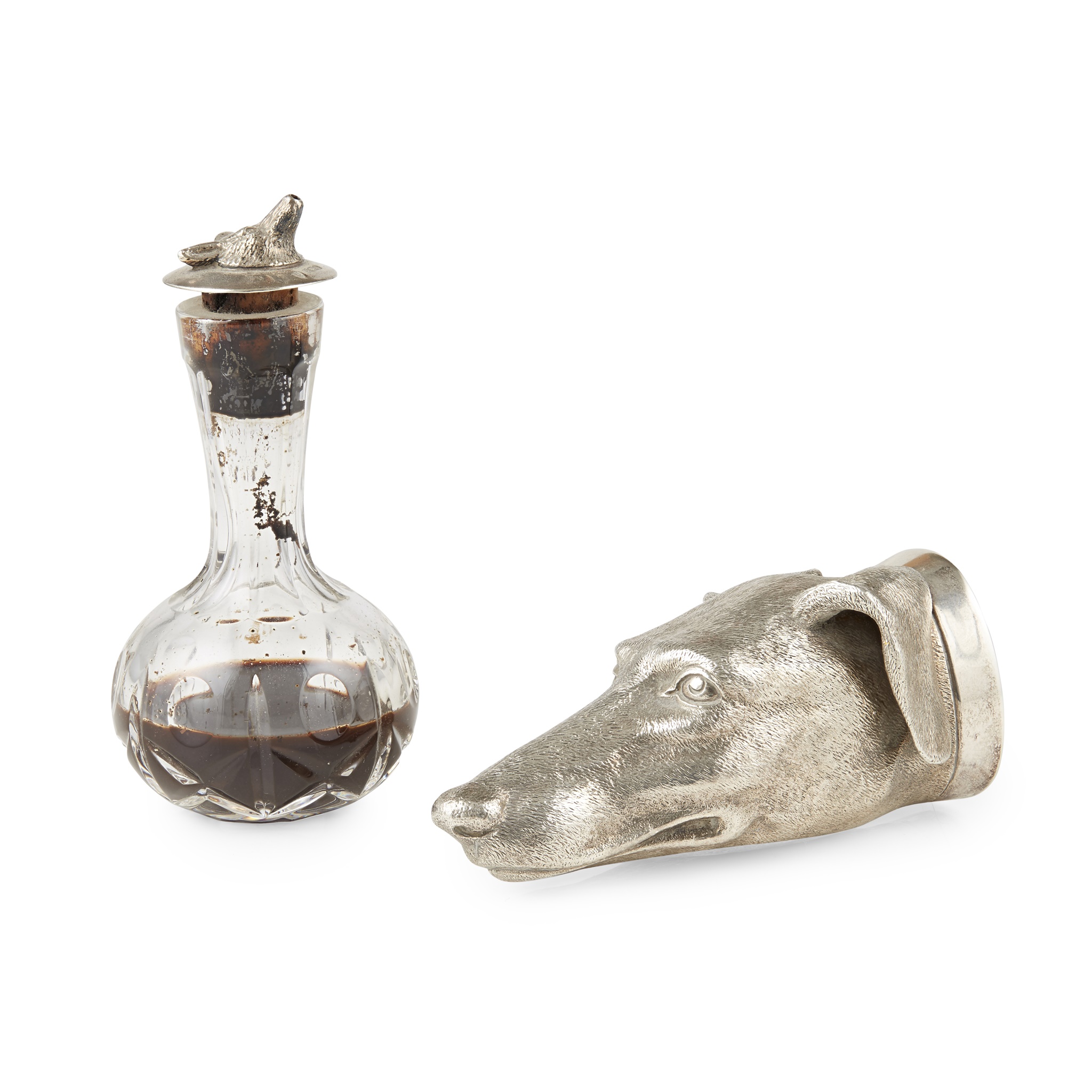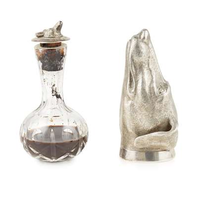 William Comyns & Sons Ltd, London 1990, modelled as a greyhound, naturalistically textured with plain flared rim; together with a bottle with novelty stopper, Birmingham, with cast fox mask (2)