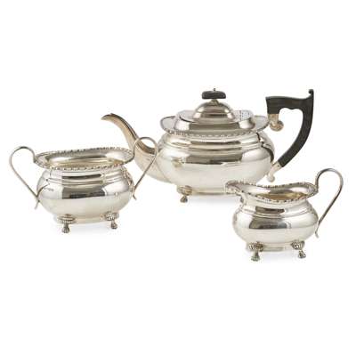 Viner's Ltd, Sheffield 1955/6, comprising teapot, twin handled sugar basin and milk jug, all of oval baluster form, cast beaded border, raised on an oval foot with four paw feet (3)