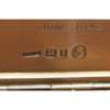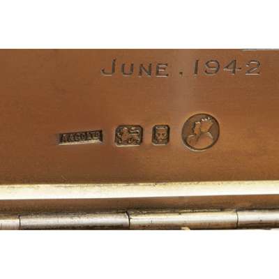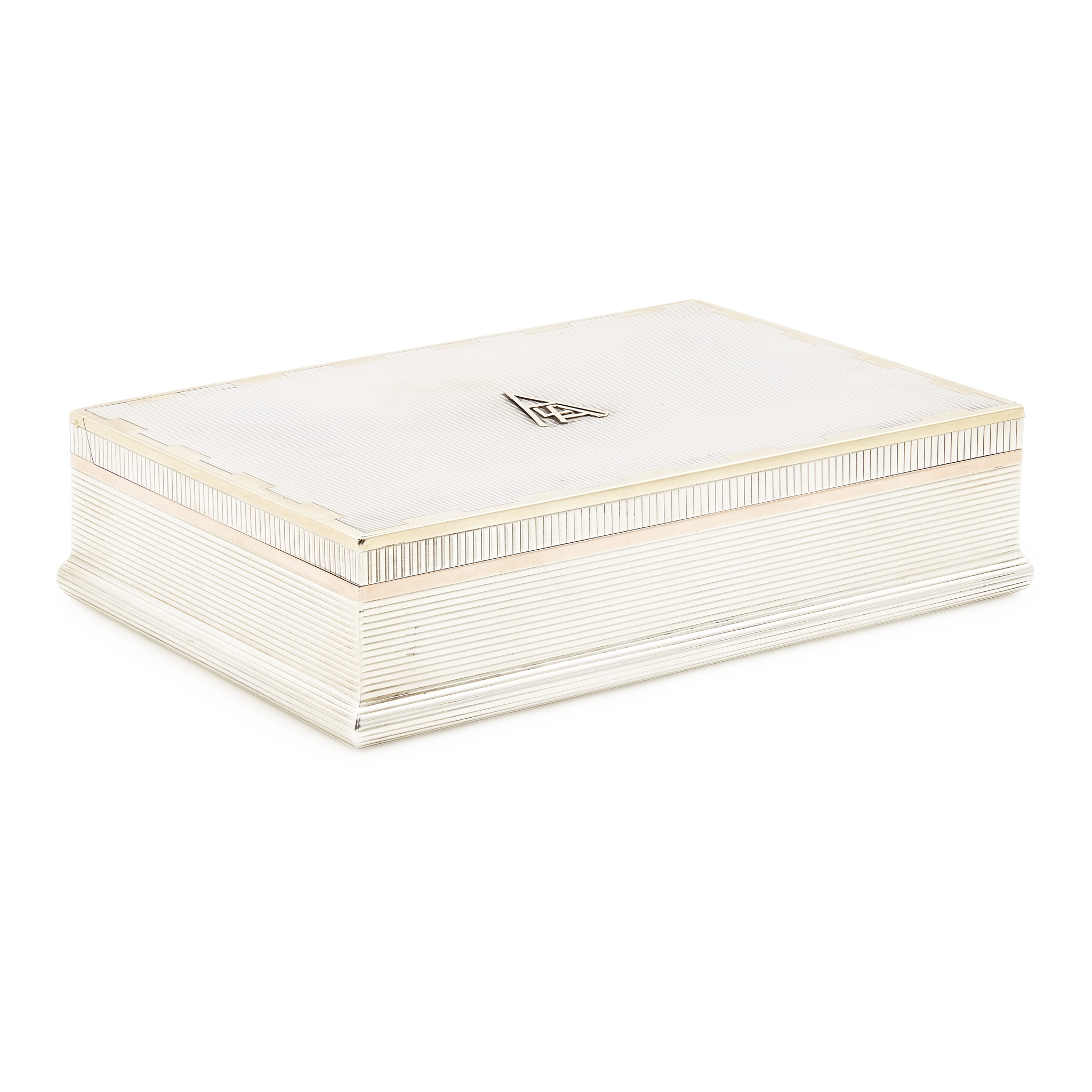 Asprey & Co Ltd, London 1937, with duty mark for the coronation of George VI and Elizabeth, of rectangular form, engine turned horizontal striations throughout, yellow metal key border to lid and rose metal border to body, applied monogram to centre of lid, the inside reveals gilt interior later engraved to lid with presentation inscription, to ARTHUR LEONARD ADAMS/ BY/ POUNTNEY AND COMPANY LIMITED/... VALUABLE SERVICES TO THE BRISTOL POTTERY, with facsimile signatures, dated June 1942, yew wood interior