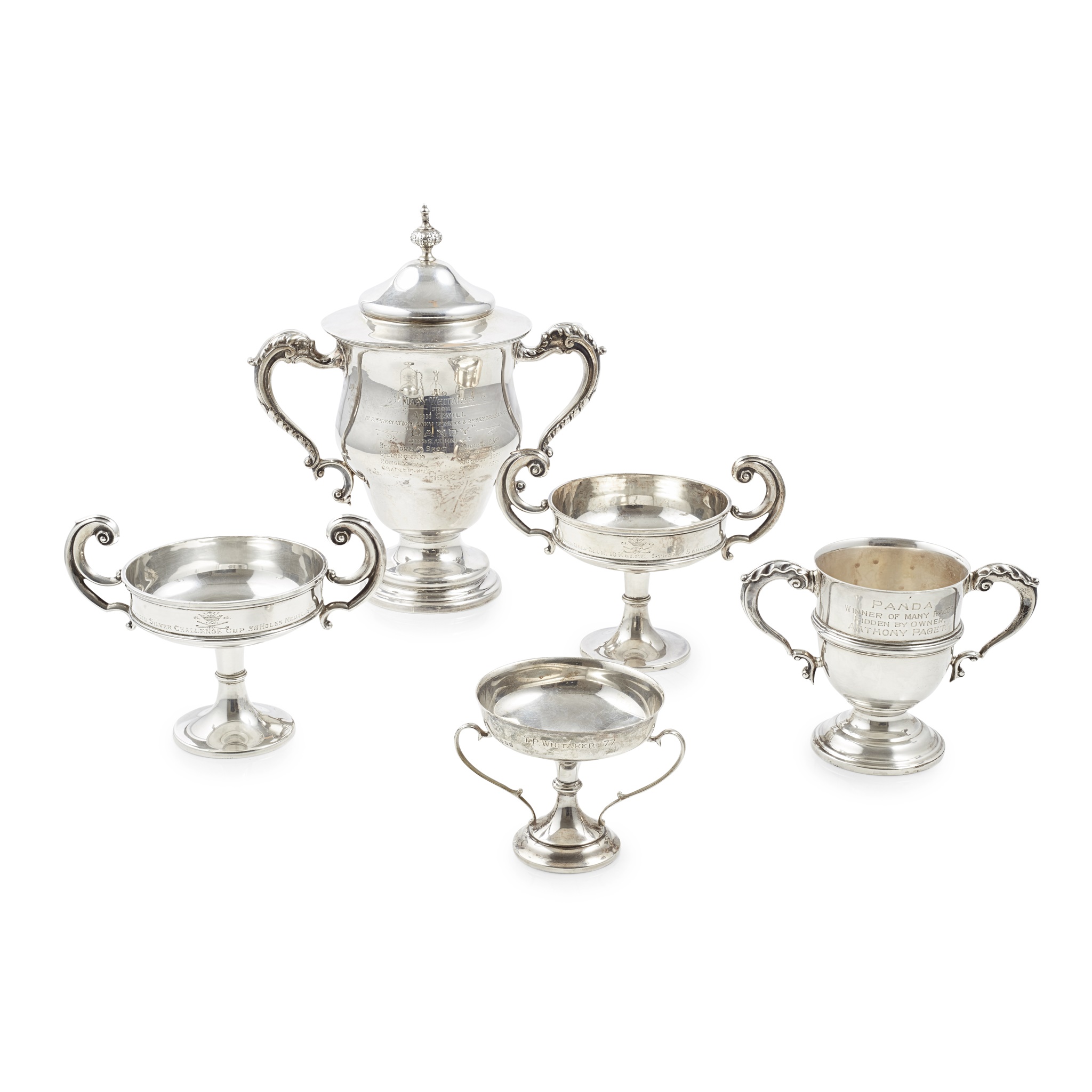 Jay, Richard Attenborough Co Ltd, Chester 1921, of baluster form, the handles of S scroll with leaf clasped detail, presentation engraving to body, raised on a domed stepped foot, the pull off lid with an intricate knopped finial; together with a collection of twin handled trophies, various makers and marks (5)