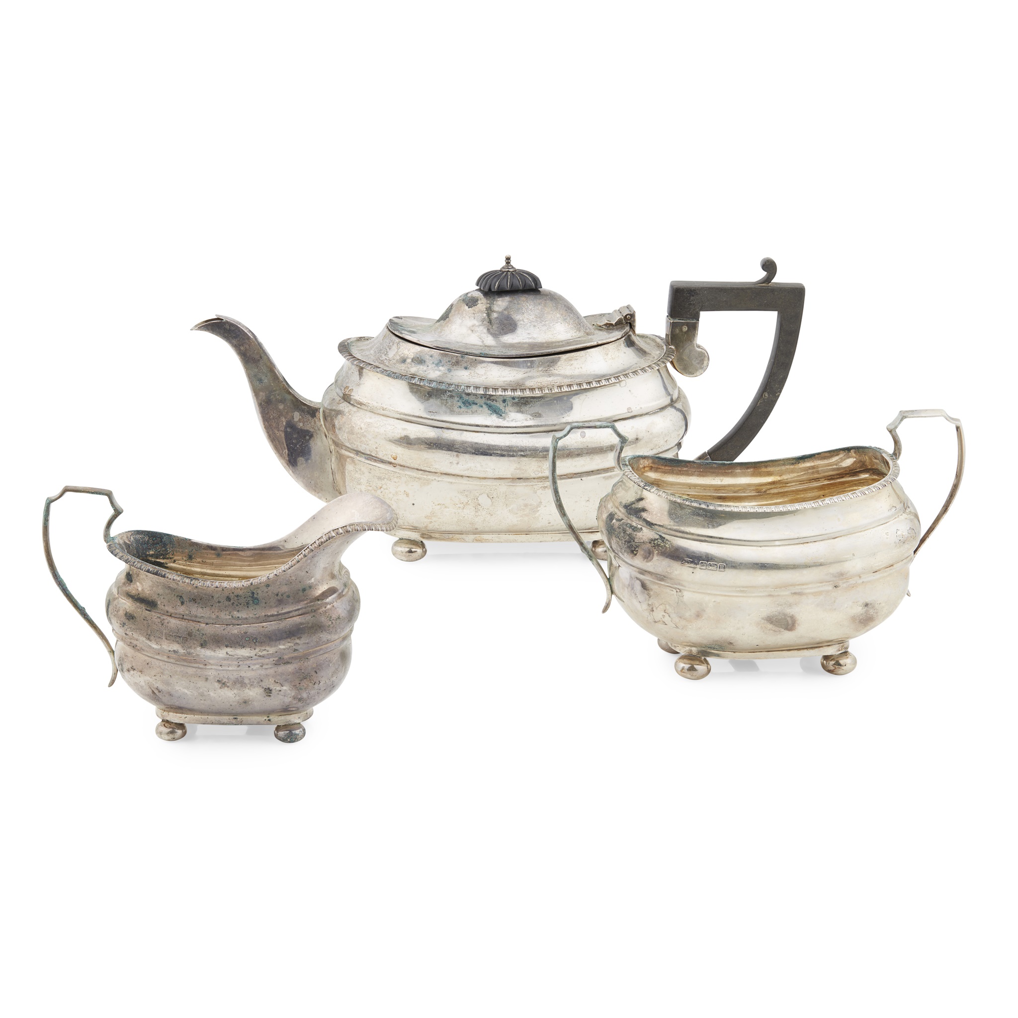 PFM, Sheffield 1912, comprising teapot, twin handled sugar basin and milk jug, of oval waisted form, gadrooned border, angular handles, all raised on four ball feet (3)