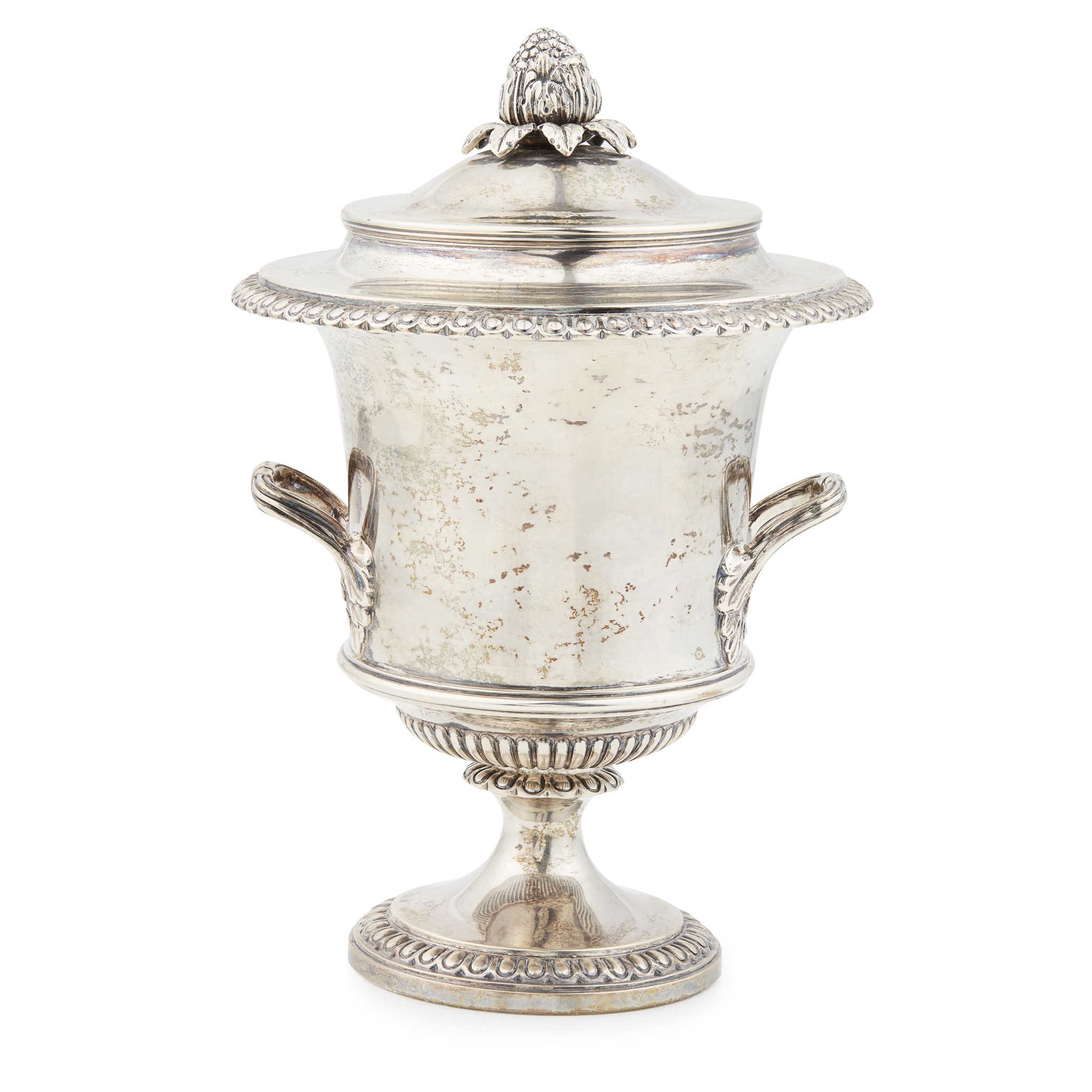 Carrington and Company, London 1911, the cover of stepped form, pineapple finial, gadrooned border, the body of plain campagna form leaf clasped handles ribbed detail to the stem, spreading foot