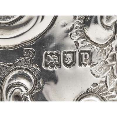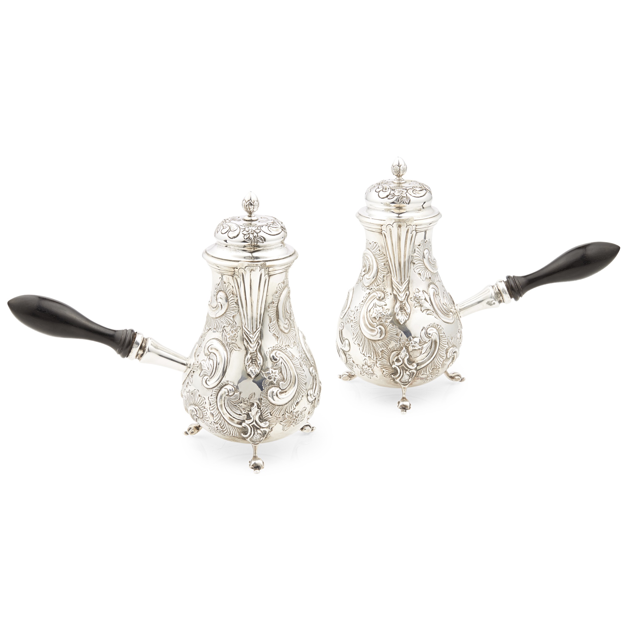 Charles Stuart Harris, London 1911, of baluster form, all over chased floral and C scroll decoration, raised on short cabriole legs turned wood handles