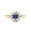 claw set with a round-cut sapphire, in a border of old round-cut diamonds, to a plain yellow metal shank stamped 18