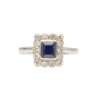 collet set with a square-cut sapphire in a border of old round-cut diamonds, to a plain white metal shank stamped 18CT