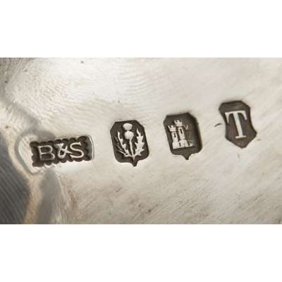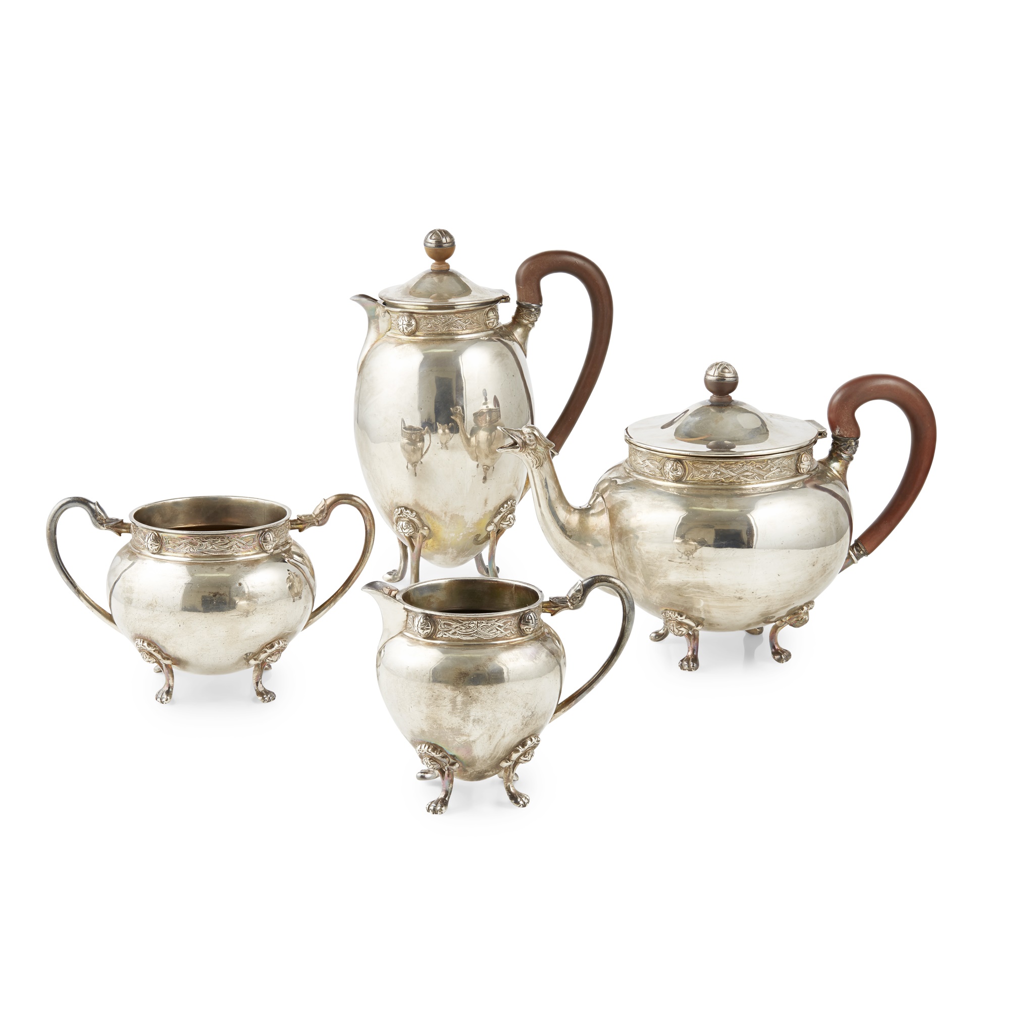 Brook & Sons, Edinburgh 1924, comprising water pot, teapot, twin handled sugar basin and milk jug, all of circular baluster form, with embossed Celtic border with Celtic knots, Gothic initials engraved to body, leaf clasped C scroll handles, all raised on four cast Celtic knot capped legs and paw feet, the teapot spout modelled as a bird's beak (4)