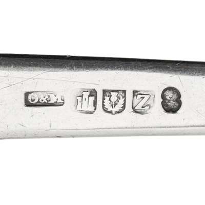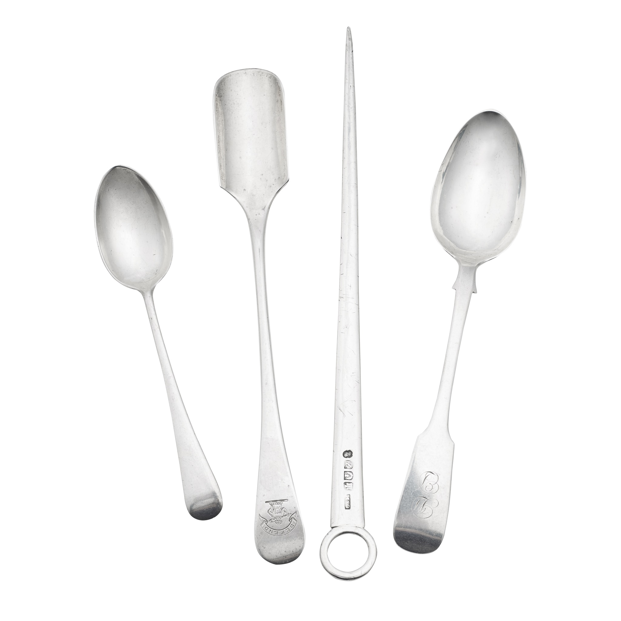 Edinburgh 1845, of Fiddle pattern, italic D/E to terminal; together with a meat skewer Edinburgh 1831; a cheese scoop, Edinburgh 1882; together with a sugar sifter, Sheffield and a set of four teaspoons, Chester 1898 (qty)