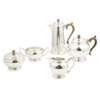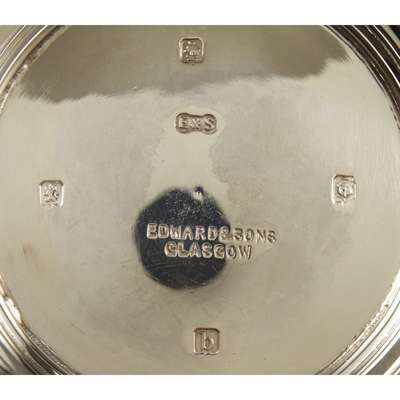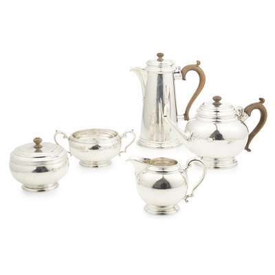 Edward & Sons, Glasgow 1924, comprising, water pot, teapot, twin handled sugar basin, sugar basin with pull off lid and milk jug, all of circular form, threaded borders, S scroll handles, raised on circular stepped base (5)