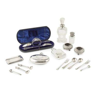 possibly James Rettie and Sons of Aberdeen, Edinburgh, 1883, decorated in the Indian taste, with two matching spoons with figural decoration; together with a group of small silver to include, condiment spoons and butter forks, card case, two small pocket flasks, one with pull off sleeve, a large cut crystal scent bottle and stopper and another small scent bottle, a cased three piece Victorian silver christening set (qty)