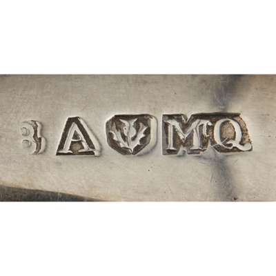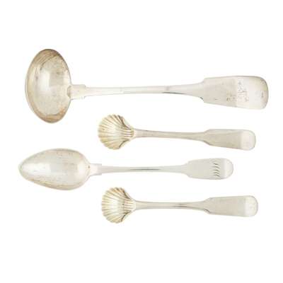 George Elder, three marks, GE, Thistle, B, fiddle pattern, engraved N in script; together with a teaspoon, Banff, William Simpson, one mark WS, fiddle pattern, engraved initials; a pair of salt spoons, John McQueen, Banff, four marks, B, A, Thistle, McQ and three marks, A, Thistle, McQ, fiddle pattern, plain, scallop shaped gilt bowls (2)