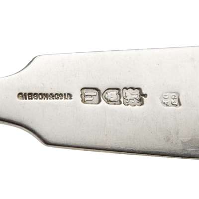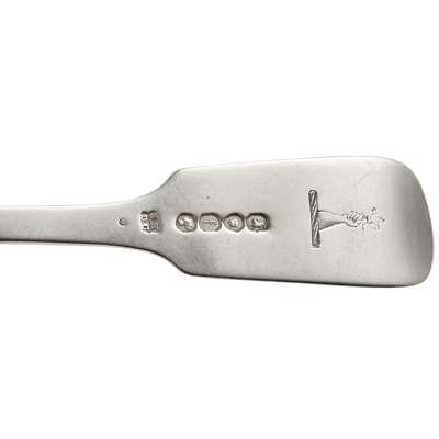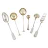 to include, a set of three Edwardian tablespoons, London 1903, of Fiddle pattern, foliate JB engraved to terminal; together with another three London 1840, vacant terminals; a set of five mid-Victorian table forks, London 1861 of Fiddle pattern; together with a pair of George III sauce ladles, London 1767, one pierced Onslow pattern, a pair of mustard spoons and two other sauce ladles (15)