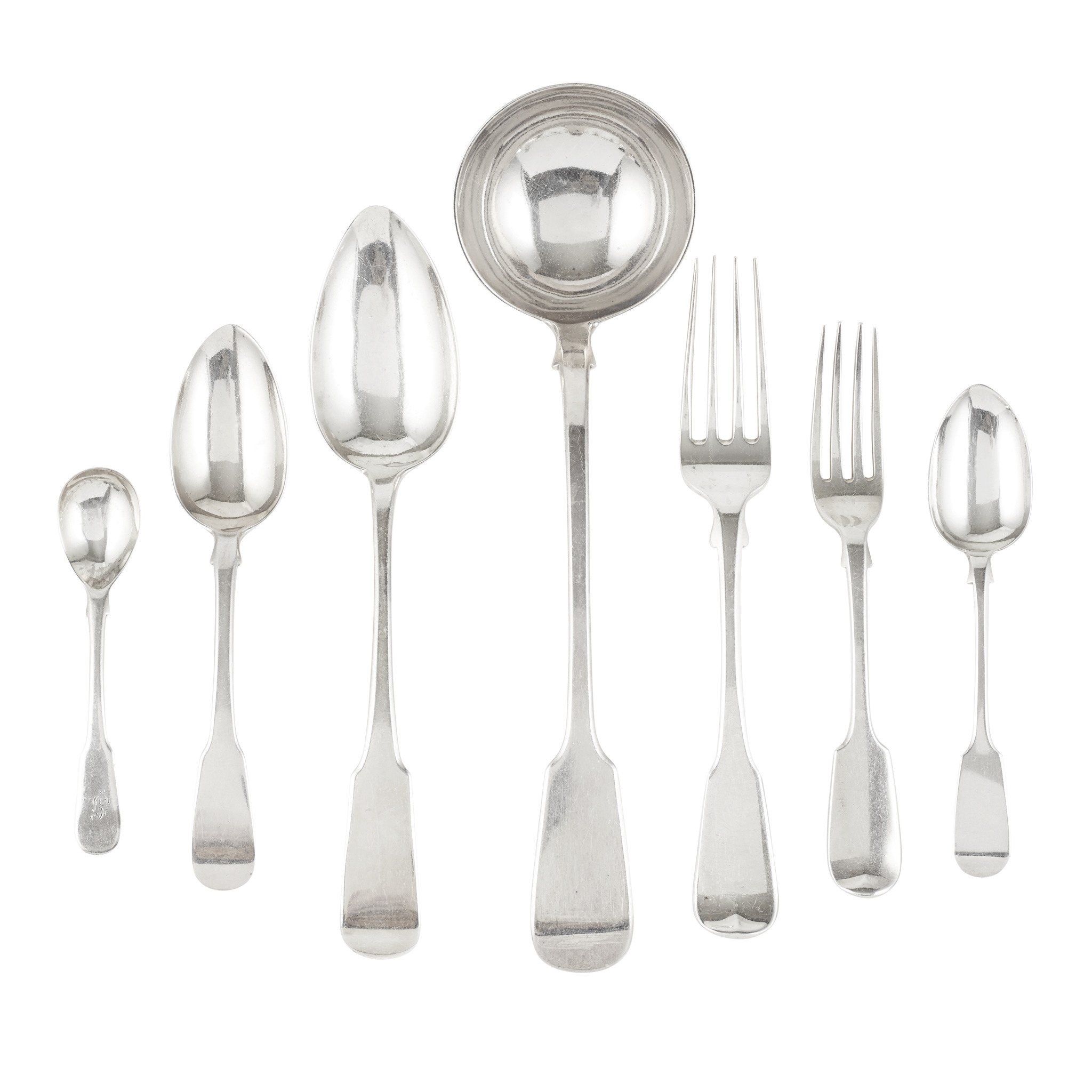 various dates and makers, various engraved crests and initials, fiddle pattern comprising; twelve tablespoons; table forks; twenty dessert spoons; thirteen dessert forks; teaspoons; four condiment spoons; soup ladle