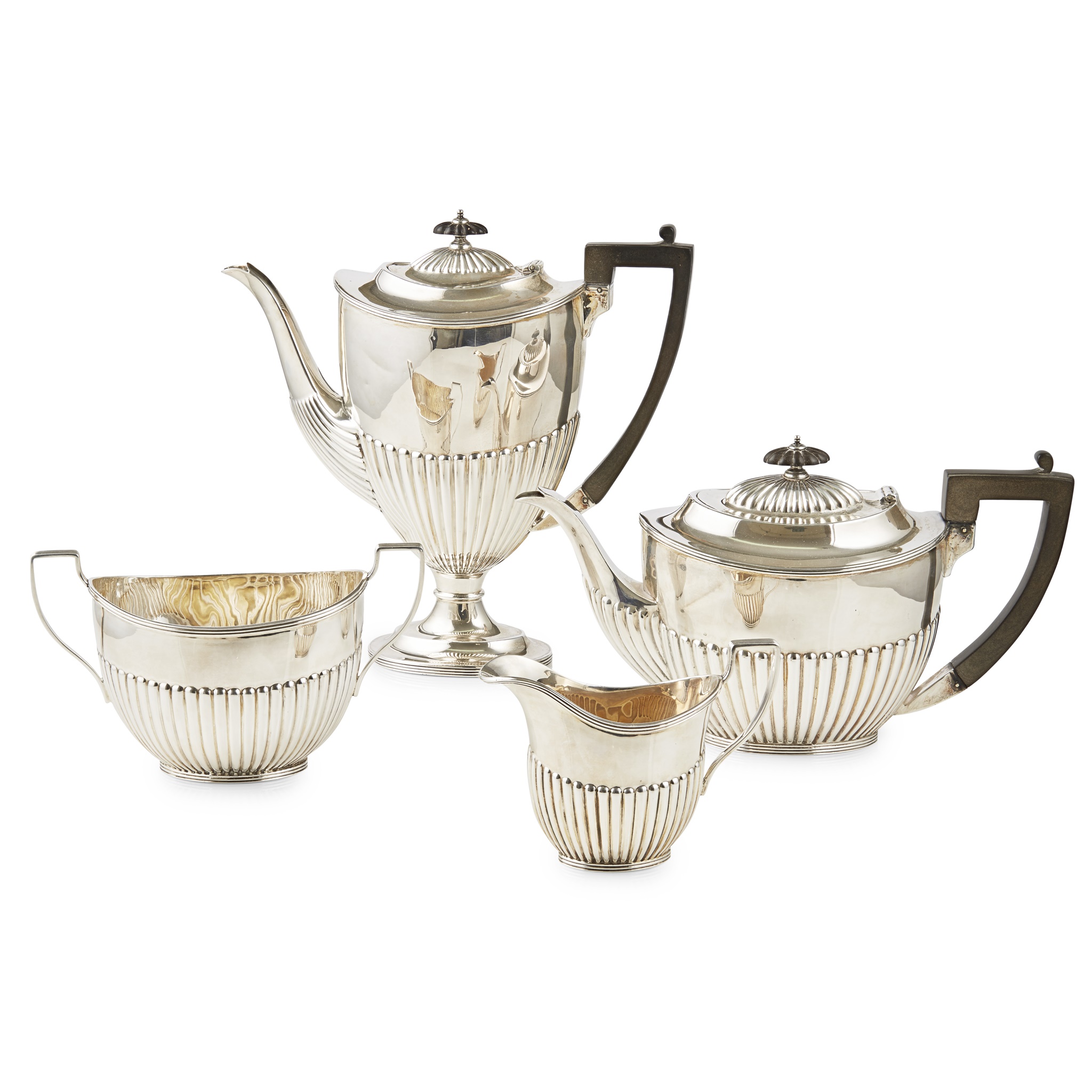 Charles Edward Nixon, Sheffield 1902, comprising; a coffee pot, teapot, twin handled sugar basin and milk jug, all of oval demi-fluted form, angular handles with threaded detail, all raised on threaded oval foot (4)