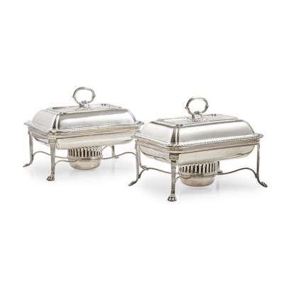 the silver entrée dishes Hawksworth, Eyre & Co Ltd., London 1896, of rectangular form, removable handles, gadrooned borders, all on plated stands of plain form with burners, the reeded legs with paw feet