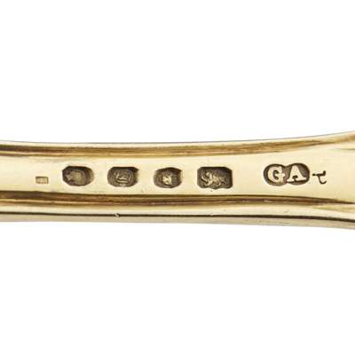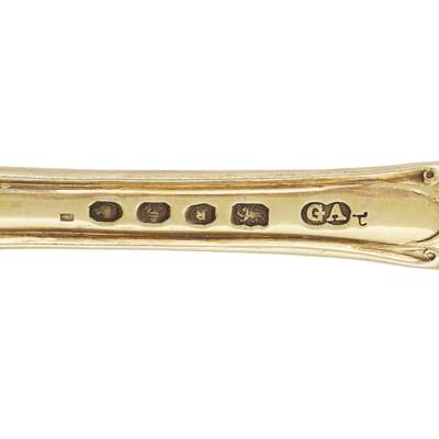 Chawner & Co, London various dates, comprising twelve forks, twelve spoons, all of double struck Devonshire pattern, crest to terminal and monogram to reverse of terminals; together with six later similar forks Goldsmiths & Silversmiths Co circa 1896, vacant terminals and six knives of similar pattern (36)