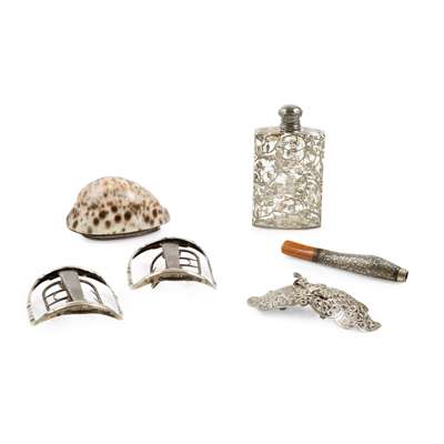 unmarked, of plain form the hinged cover engraved James Watson, together with a pair of large George III shoe buckles, William Eley, marked patent; silver wire inlaid cheroot holder with coral mouthpiece; silver overlaid glass scent bottle; a niello decorated buckle with shamshir clasp (qty)