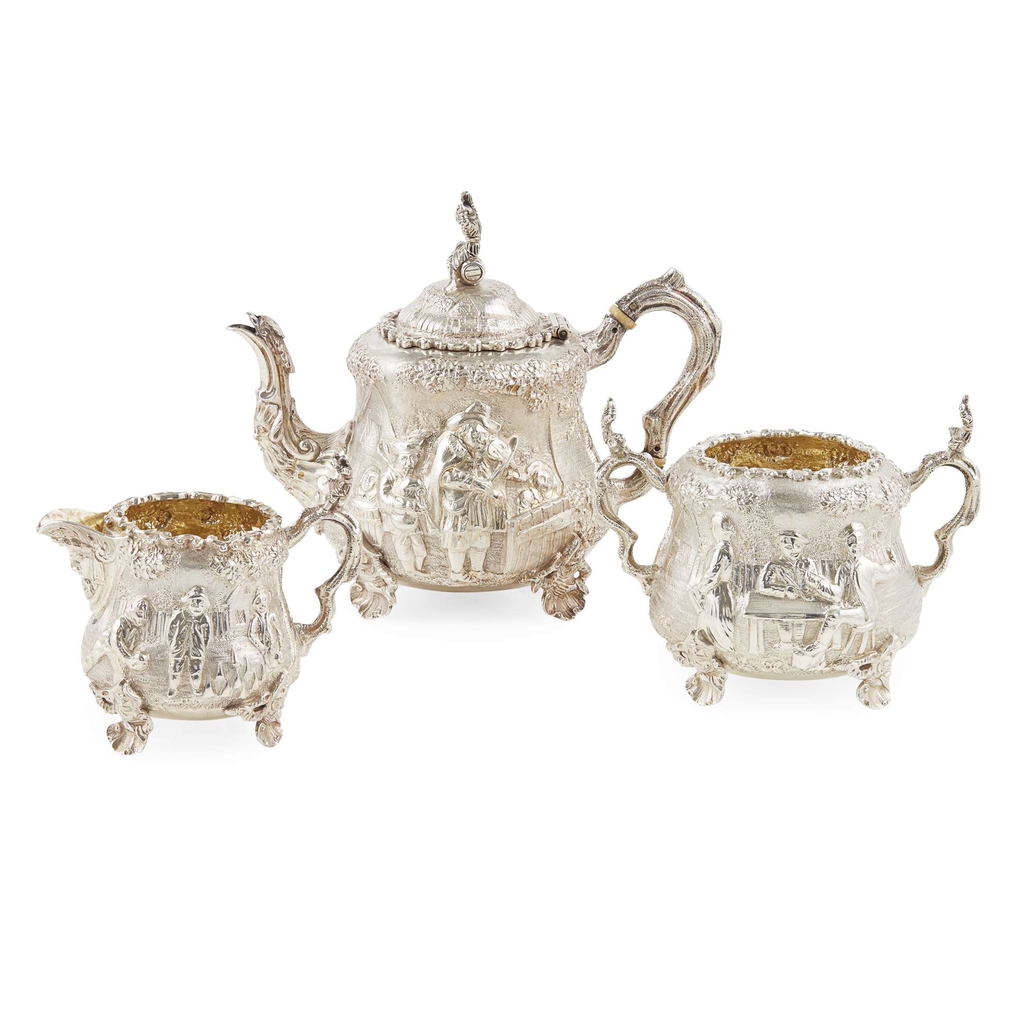 Daniel and Charles Houle, London 1873, of small size with bold decoration of tavern and other country scenes with figures, the teapot with a drinker seated on a tun, mythical bird's head for the spout, comprising; teapot, sugar and cream, all raised on cast shell feet, the handles of naturalistic form with carousing figure terminals (3)