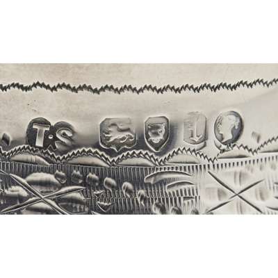 Thomas Smiley, London 1866, of pear form, bright cut engraving throughout, ornate oval cartouche with bow and foliate border with scroll leaf clasped handles; together with a central European early 19th century sugar basin; an unmarked punch ladle, a collection of flatware, including two pairs of Irish tongs; napkin rings; together with two plated tablespoons (qty)