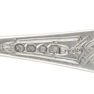 Mainly George Adams, London 1860, Old English pattern with engraved Renaissance style cartouches to either side, engraved crest, comprising: twelve table spoons; twelve dessert spoons; eighteen table forks; twelve dessert forks; eleven teaspoons; soup ladle; large serving spoon; pair sauce ladles