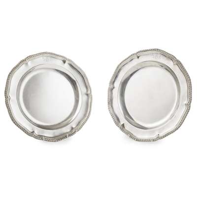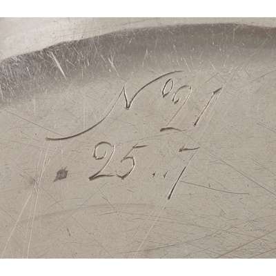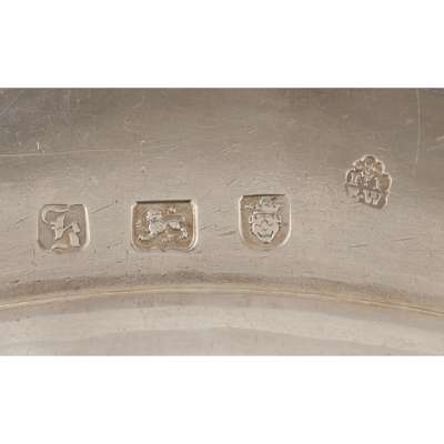 Parker and Wakelin, London 1765, of conventional form, slight serpentine shape, gadrooned border, the bouge engraved armorials, scratch numbered and weights to underside