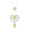 of open scrolling design, set throughout with graduated eight-cut and round brilliant-cut diamonds, set with a round-cut, trap-cut and pear-shaped peridots, to a detachable trace link chain, with optional brooch fitting