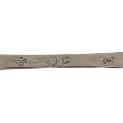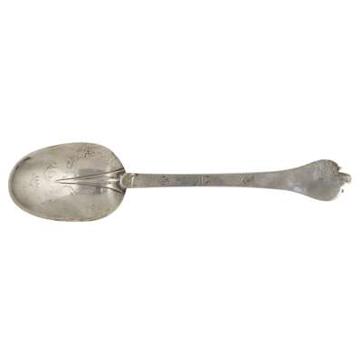 maker's mark IP star above and crescent below, London 1691, with lace decoration to front of stem and rear of bowl, prick engraved initials to terminal