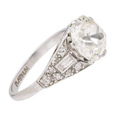 claw set with an old cushion-cut diamond, each shoulder collet set with a baguette-cut diamond in a pavé set old round cut diamond surround, to a plain shank stamped PLATINUM