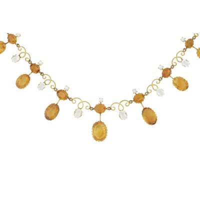 composed of alternating scrolling links, claw set with fringed detail of seed pearls, oval citrines and colourless gems, to a hook clasp, unmarked