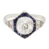 collet set with a cushion-cut diamond in a channel set border of sapphires, each shoulder set with three old round-cut diamonds, to a plain shank, unmarked