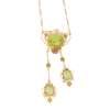 collet set with a cushion-cut peridot in a pierced filligree border, suspending two asymmetric oval peridot set drops with similar style border, to integral elongated Figaro chain, unmarked