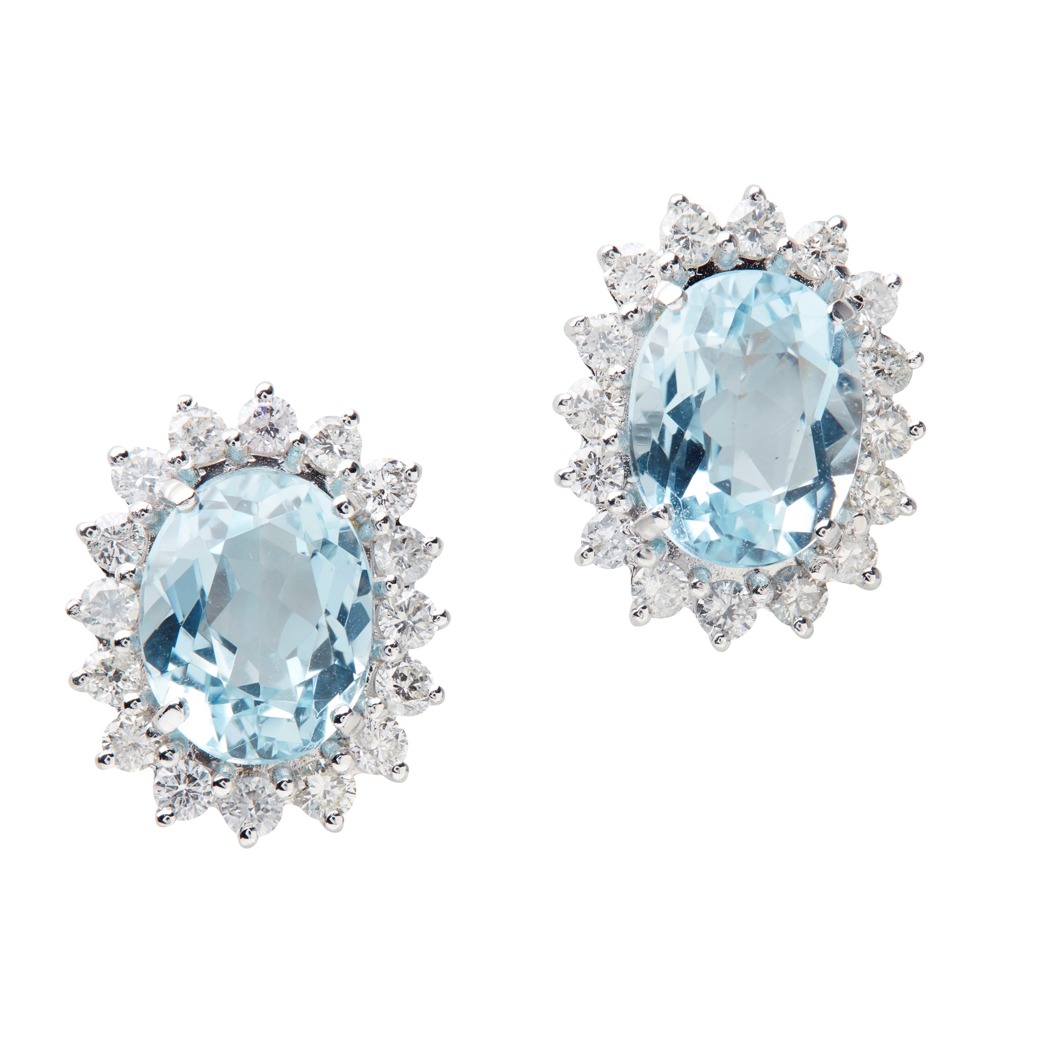 each claw set with an oval mixed-cut aquamarine, in a border of round brilliant-cut diamonds, to 18ct white gold post and butterfly fittings stamped 750