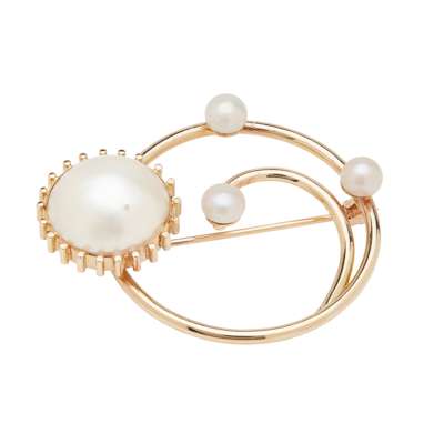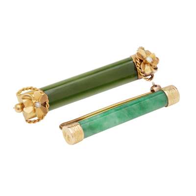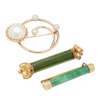 to include a 9ct gold Hamilton & Inches circular pearl set brooch, a plain cylindrical jade set bar brooch, stamped 18/SO and another similar with floral pearl set detail to terminals, stamped 15C