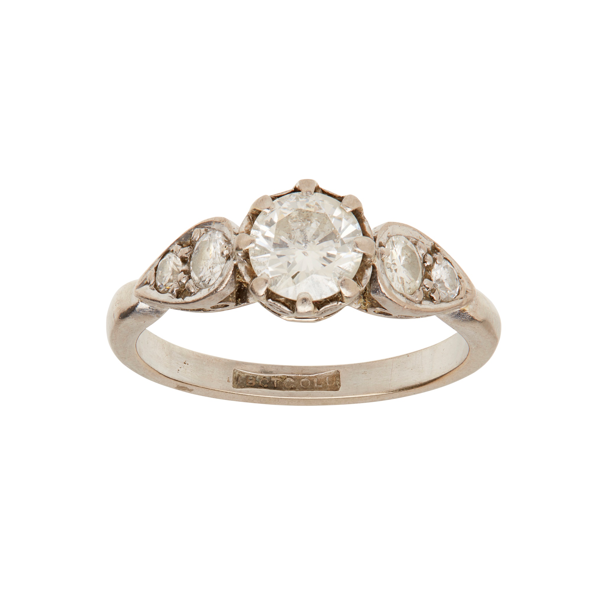 claw set with a single round brilliant-cut diamond, each shoulder set with two graduated round brilliant-cut diamonds, shank stamped 18CT GOLD
