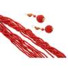 composed of eight strands of coral beads, to an unmarked yellow metal stylised bow clasp; together with a pair of coral set pendant earrings, each set with a ball of coral beads suspended from an oval panel set with a coral cabochon, to hook fittings, indistinctly marked