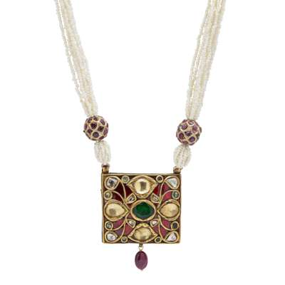 rectangular, with foiled oval mixed-cut beryls and table-cut diamonds, the reverse with a bird, flower and foliate in cream, cornflower blue and translucent red and green enamel, with a tumbled pebble ruby bead drop, on a multi-strand seed pearl necklace with two ruby-set beads