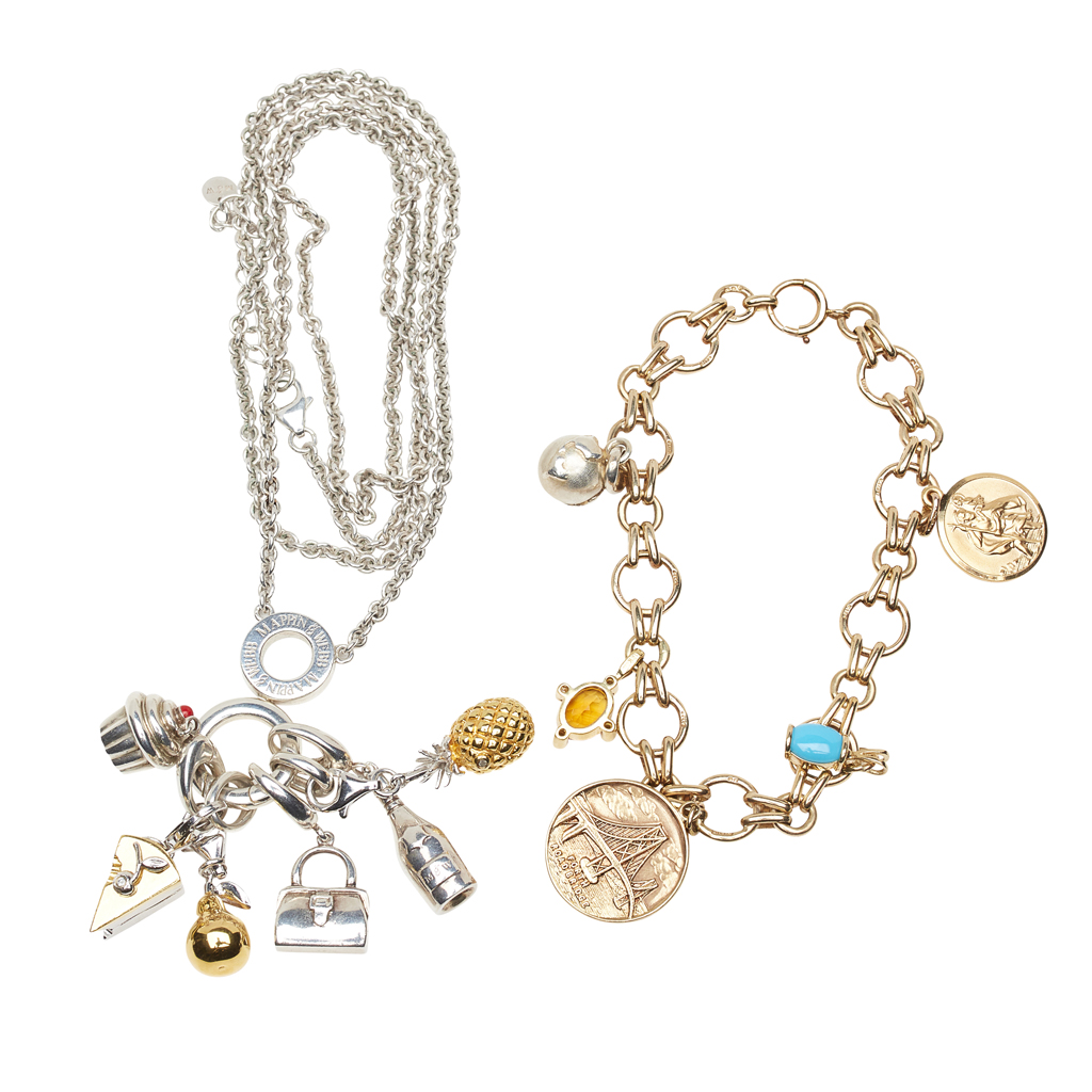 composed of circular fancy links, suspending various gem set and circular charms; together with a Mappin & Webb necklace, stamped 925, suspending various charms, including a pineapple, purse and a slice of cake