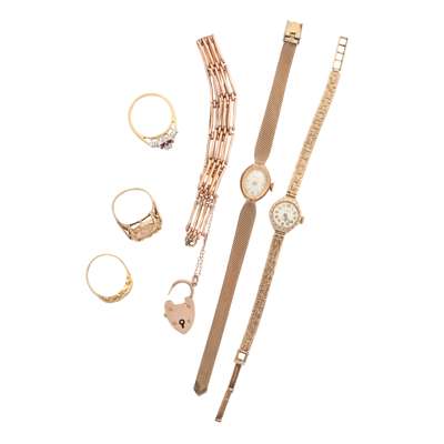 to include an 18ct gold Victorian sapphire and diamond set ring; a gatelink bracelet with a 9ct padlock clasp, a 9ct gold signet ring; two lady's wrist watches and a paste set ring