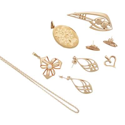 to include a 9ct gold Ola Gorie Celtic style brooch and matching stud earrings and another pair of 9ct gold Ola Gorie pendant earrings; together with a 9ct gold pearl set floral pendant, a diamond set 9ct gold heart shaped pendant and a 9ct gold locket and trace link chain