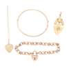 to include a Victorian coral and pearl set shield pendant, with French control marks; together with an opal set curb link bracelet stamped 9C, with a 9ct padlock clasp; a bangle of pierced design, stamped 15CT, and a heart shaped locket with trace link chain, apparently unmarked