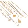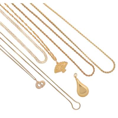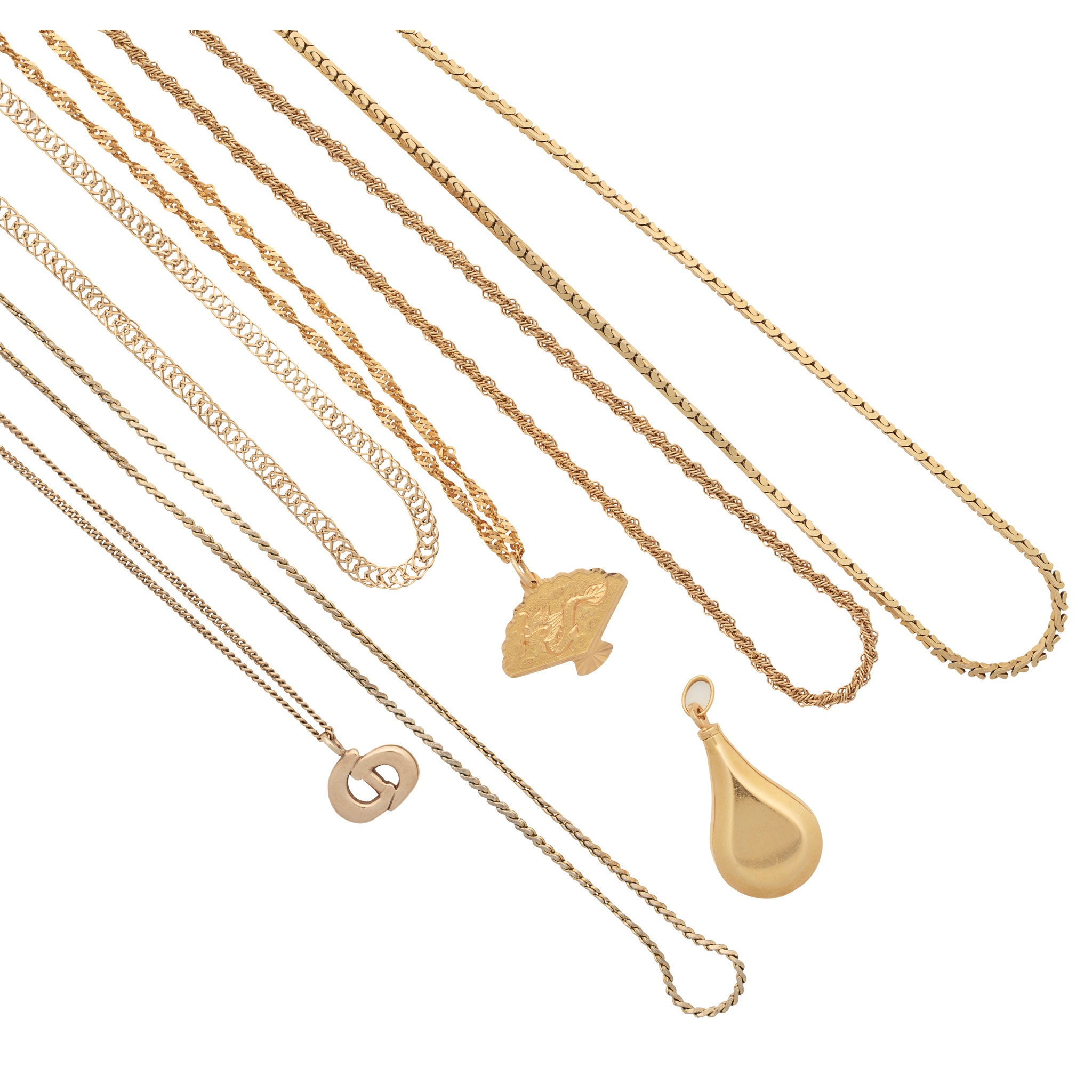 to include an 18ct gold flattened fancy link necklace and a drop shaped pendant stamped 750; an unmarked Chinese pendant and necklace; a 9ct gold flattened curb link chain and 'CD' pendant; three further unmarked chains