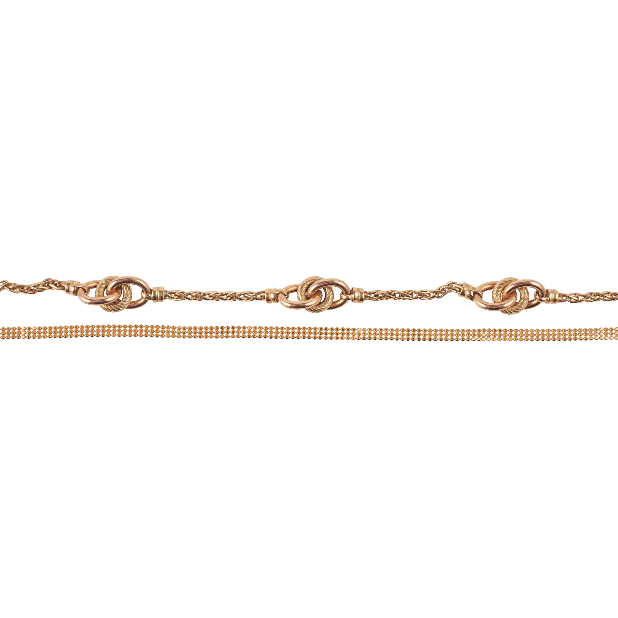 composed of fancy links, set at intervals with three larger fancy link details, to a lobster clasp stamped 750; together with a fancy link chain, to a hook clasp stamped 916