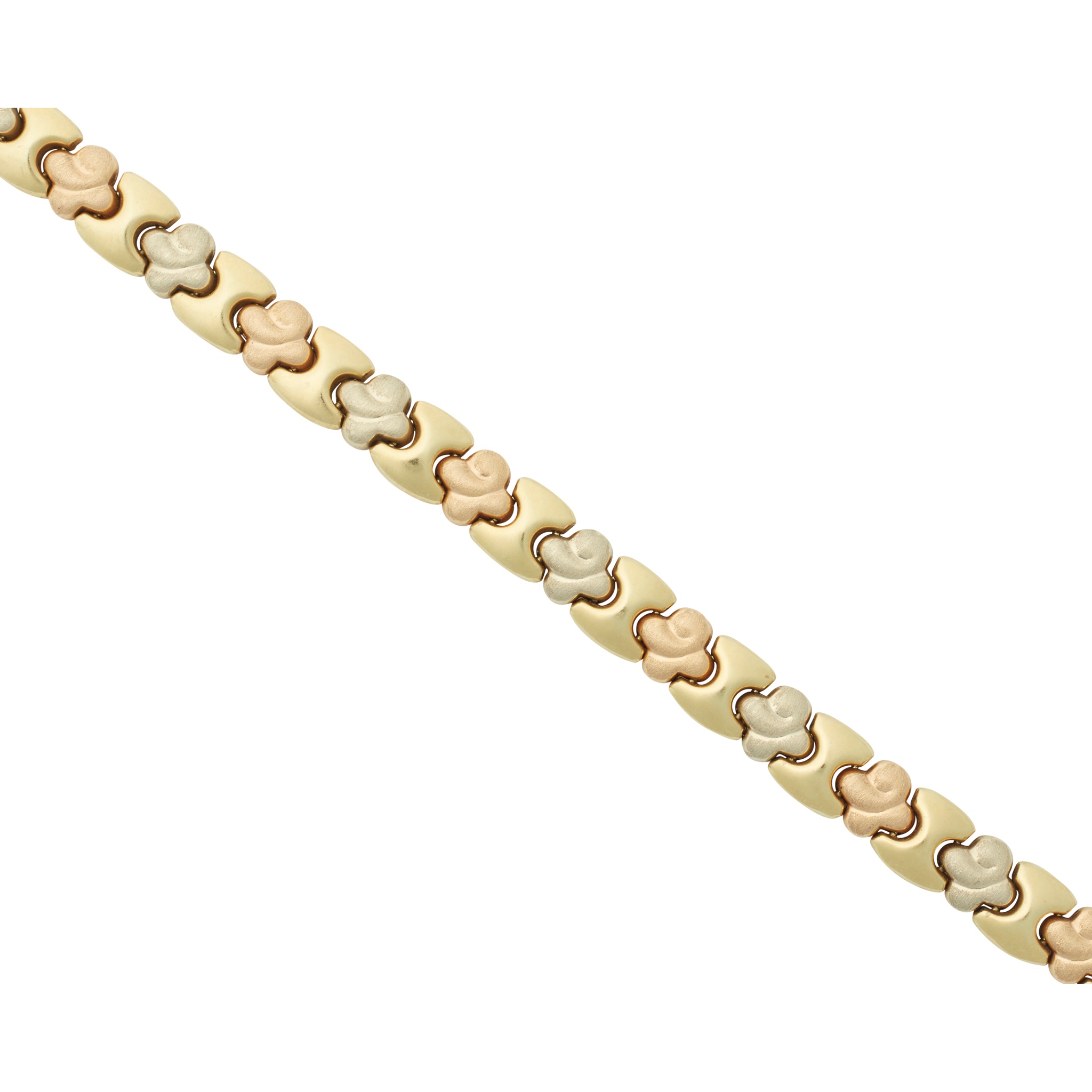 composed of shaped polished and satin finish links, to a concealed clasp and safety clips, stamped 750