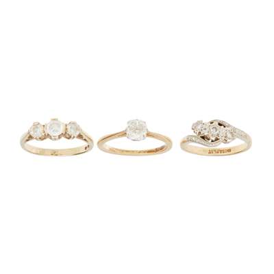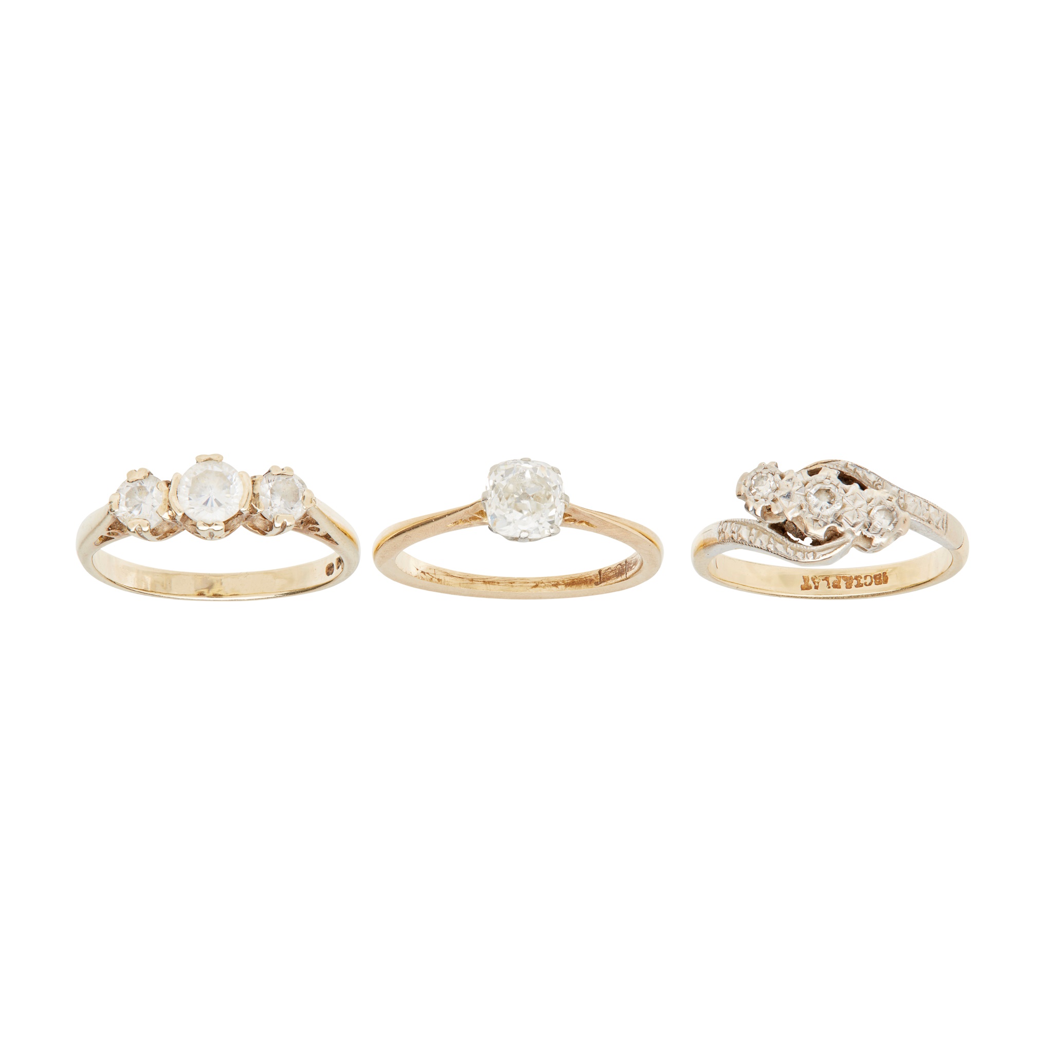 claw set with a cushion-cut diamond, to a plain yellow metal shank stamped 18ct; together with a three stone illusion set diamond ring, stamped 18CT PLAT, and 9ct gold three stone paste set ring