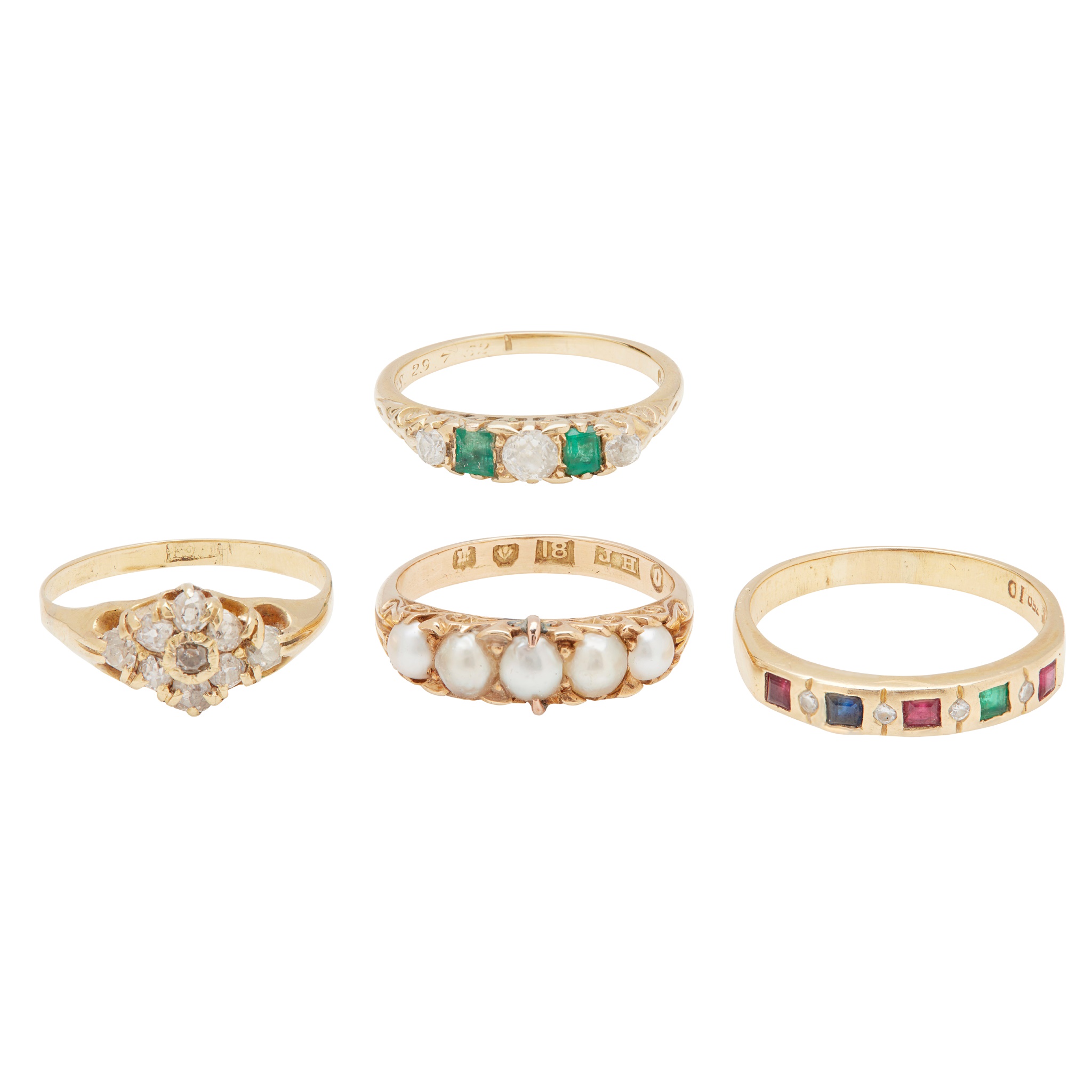 to include an 18ct gold pearl set ring; an emerald and diamond set ring, stamped 18ct; a diamond cluster ring, indistinctly marked; a ruby, emerald, sapphire and diamond set half eternity ring, stamped 750