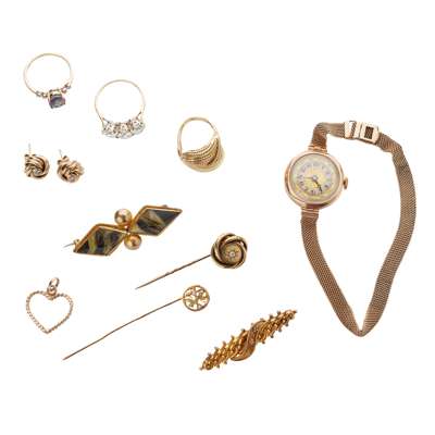 to include a 9ct gold heart shaped pendant, a Victorian bar brooch; a lady's 9ct gold cased wrist watch, a cameo ring; two paste set rings and a pair of paste set earrings; various brooches, pins etc.