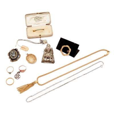 to include a fancy link neck chain with tassel pendant, stamped 750; a 22ct gold wedding band and a 9ct gold signet ring; a paste set ring and a seed pearl and turquoise set bar brooch; various other pendants, chains and brooches etc.
