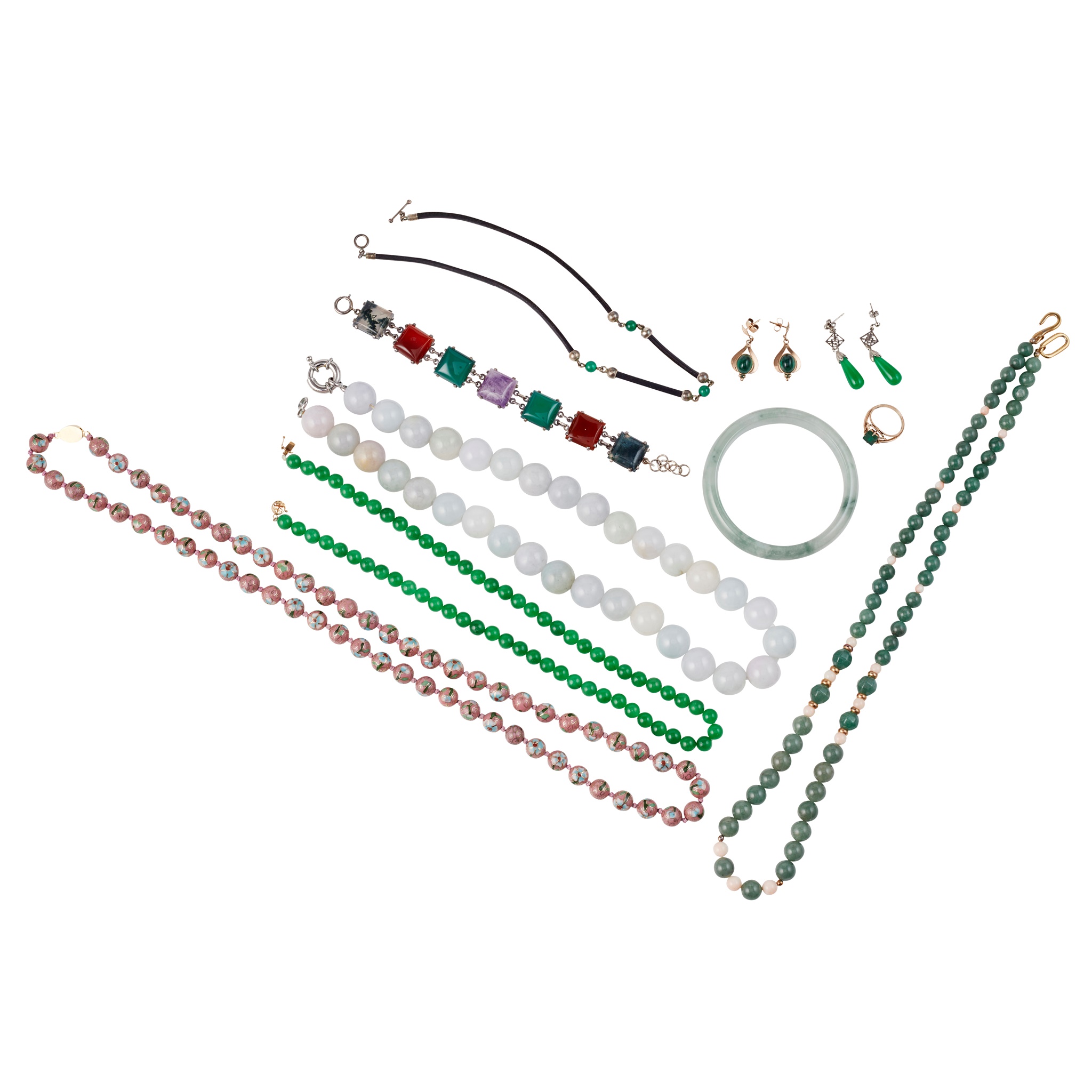 to include a jade bangle, various green hardstone and jade beaded necklaces, a hardstone panel bracelet, a pink floral enamelled beaded necklace; an emerald set ring, unmarked; a pair of cabochon emerald set pendant earrings and another pair of green hardstone set earrings