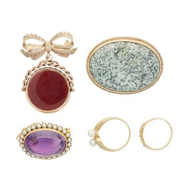 to include a 9ct gold agate set swivel fob with a 9ct gold bow brooch fitting; a 9ct gold oval agate set brooch; an amethyst and seed pearl set brooch, stamped 9CT; together an 18ct gold pearl and diamond set ring and another stamped 18K 750