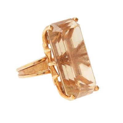 possibly French, claw set with an emerald-cut citrine, to a plain yellow metal shank with textured shoulders, indistinct control marks to exterior of shank